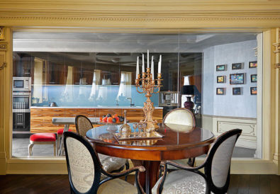 Джессика Хельгерсон основательно поменяла концепт кухонной зоны, добавив мраморные столешницы и художественную чеканку на потолке, а также воссоздав деревянные полы – такие, как и во всем доме. По словам дизайнера, пол в каждой комнате на первом этаже имеет свой уникальный мозаичный элемент. В кухне узор создавался дизайнерами индивидуально с целью незаметно дополнить элементы в смежных комнатах. Благородное дерево, мрамор, черная обивка мебели и металлические элементы в ней придают помещению сдержанный аристократизм, гармонично дополняя столовую в соседнем помещении. Центром комнаты стал мраморный стол на металлической основе в тон столешниц в кухне, а дополнили его черными кожаными стульями в современном стиле. О классическом дыхании здесь свидетельствуют простые прямолинейные формы и сдержанность планировочных решений.