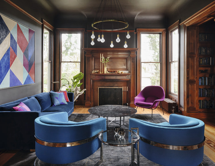 В связи со стилистикой всего дома и эпохи, которую он олицетворяет, в оформлении задействовано большое количество дерева. Цветовая палитра подобрана с целью акцентировать внимание на историческом прошлом здания. В основе – насыщенные теплые тона наряду с яркими вкраплениями синего и лавандового. В доме несколько гостиных, и каждая отличается по стилю, а главная является местом пересечения времени. Здесь исторический аристократизм подчеркнут современными элементами в виде дизайнерской мебели насыщенных синих оттенков и декора, включая светильники в стиле контемпорари.