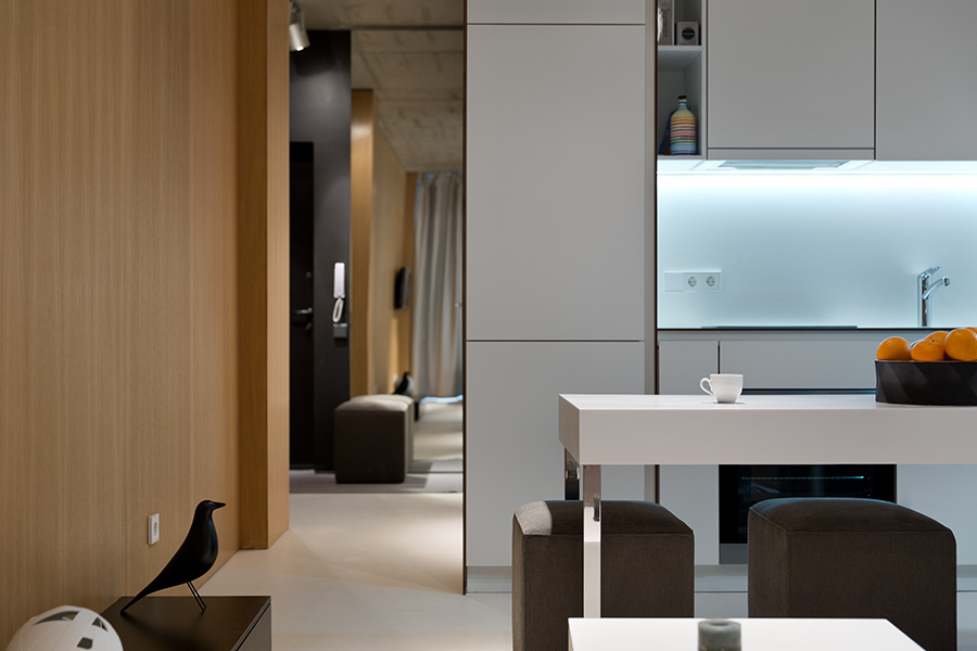 Многие предметы мебели в наших интерьерах разрабатываются индивидуально. К примеру, при проектировании одной из малогабаритных квартир перед нами стояла задача максимально оптимизировать пространство гостиной, совмещенной с кухней. Для этого мы разработали кухонный блок, используя в качестве основного материала HPL-панели. Их износоустойчивые характеристики позволили нам не опасаясь использовать их в зоне кухни, а минимальная толщина панелей значительно сэкономила пространство.