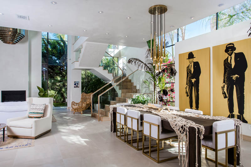 Интерьер стал воплощением современного калифорнийского бохо-шика, который предполагает смешение различных стилей и ярких акцентов. Современные дизайнерские вещи и роскошные предметы декора соседствуют с утонченными винтажными находками.