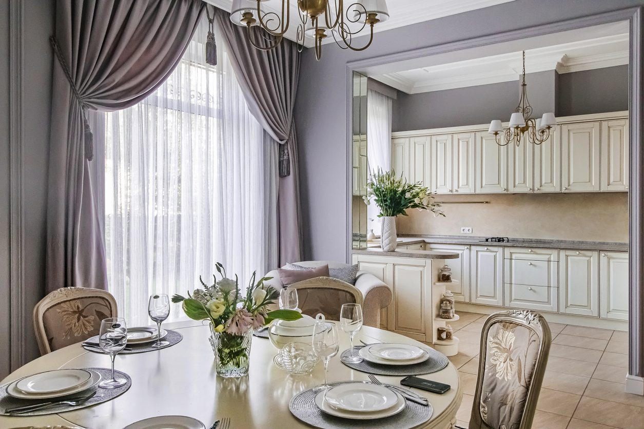 Так, для стен гостиной подобрали дымчато-серый цвет светлого оттенка в общей массе и более темного между молдингами на длинной проходной стене. Для столовой и кухни выбран более легкий серый цвет оттенка фиолетовой дымки. Большие панорамные окна, использование зеркал на стенах поддержали заданную этим цветом легкость. Центром гостиной стал большой круглый стол с резьбой, окруженный изящными классическими стульями.