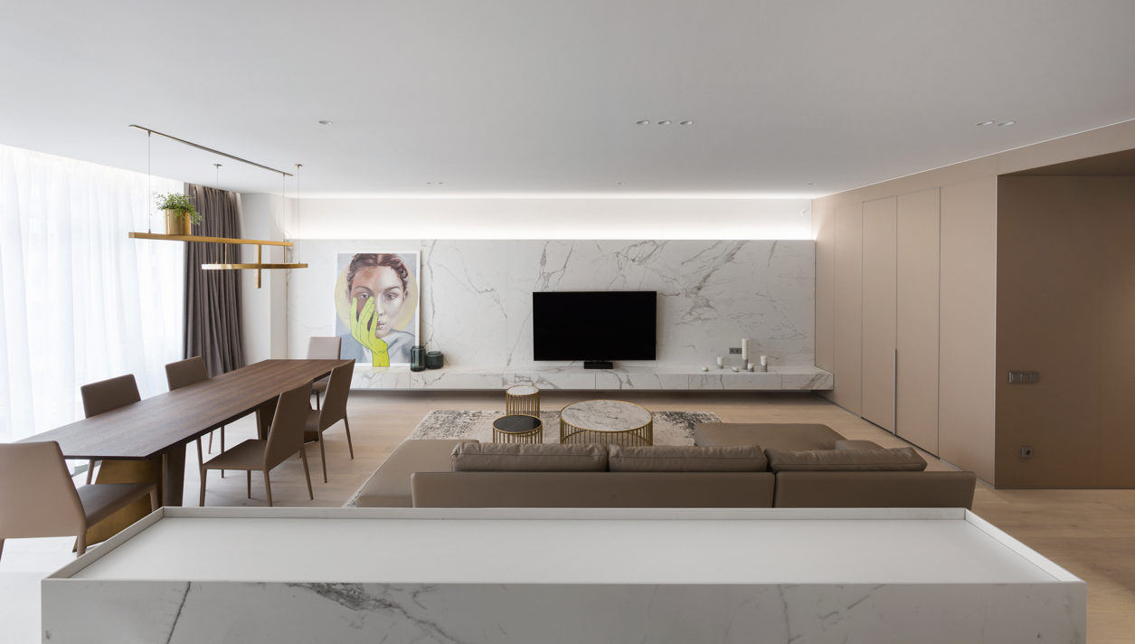 Сердцем гостиной стал вытянутый силуэт мраморной стены с подвесной консолью, нашедший свое «текстурное» продолжение в кухонном острове и столешницах журнальных столиков. Массивный кожаный диван от бренда Poliform, скульптурный обеденный стол от Miniforms, светильник известного предметного дизайнера Дмитрия Козиненко и полотно «Моя планета» авторства украинской художницы Валентины Засуцкой прекрасно дополнили композицию минималистской лаунж-зоны.