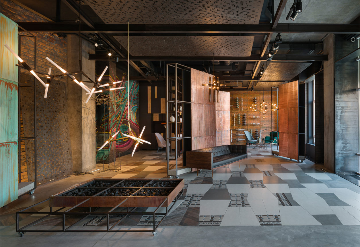 Общая идейная линия, объединяющая все светильники, – промышленный дизайн. В его основе – использование материалов, применяемых в архитектуре, таких как металл, дерево, стекло в сочетании с LED-лампами. Их изящные футуристические силуэты тенями играют на фоне патинированной меди, стеллажей с элементами винтаж-металла, голого бетона, кирпича и так далее. Световая инсталляция выгодно подчеркивает коллекцию стрит-арта в различных стилях, пол с авторским узором, а также мебель, выполненную по эскизам архитектора.
