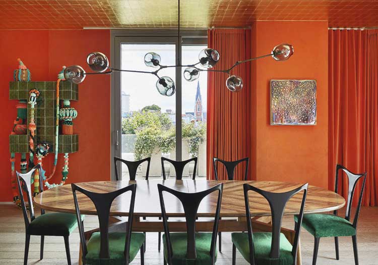 Что касается цветового решения интерьера, то в его палитре автор активно использовал насыщенные оттенки, в том числе и «помпейский красный», в котором выполнена вся зона столовой. Здесь мастерски подобран единый цвет стен и штор, а горячий и одновременно благородный цвет выглядит великолепно как при дневном, так и при искусственном освещении. Потолок столовой выложен золотистой плиткой, которая словно поджигает насыщенный красный.