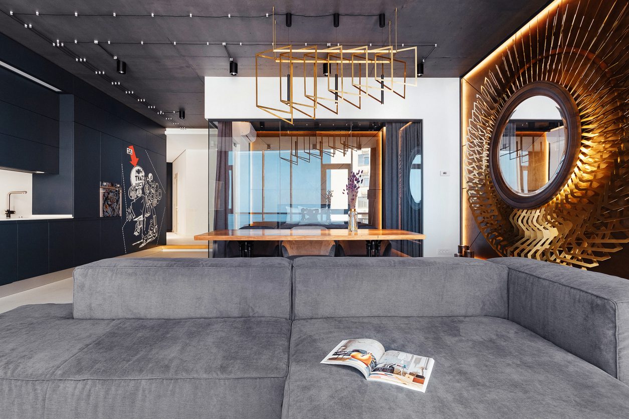 Особенностью всего интерьера стали высокие панорамные окна, которые позволяют наслаждаться прекрасным морским пейзажем не покидая границ квартиры. Сам же интерьер, несмотря на свою лаконичную концепцию, был дополнен не только элегантными, а и брутальными технологичными акцентами. Его монохромное цветовое решение авторы проекта разбавили яркими вкраплениями теплой древесины в виде большого обеденного стола в зоне кухни, а также многочисленными латунными элементами.