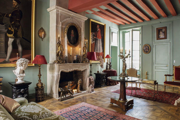 Из оригинальных элементов в гостиной были сохранены потолочные балки, паркет и камин; с учетом того, что главным элементом декора являлись многочисленные произведения искусства и антикварная мебель, задачей дизайнеров было подобрать фоновый цвет стен так, чтобы он выгодно оттенял их. Светло-зеленый оттенок краски в сочетании с красными потолочными балками прекрасно справились с этой целью, а благодаря совмещению комнат даже крупные экспонаты смотрятся уместно – например, портрет кардинала Лотарингского справа от камина или же копия находящейся в Лувре картины «Самсон и Далила», занимающая центральное место над светло-серым диваном эпохи Людовика XV. Воспроизводя стиль Франции XVII–XVIII веков, декор гостиной органично сочетает предметы трехсотлетней давности с античными творениями: самый старый объект в квартире – скульптурная голова слева от камина, датированная II веком до н. э.
