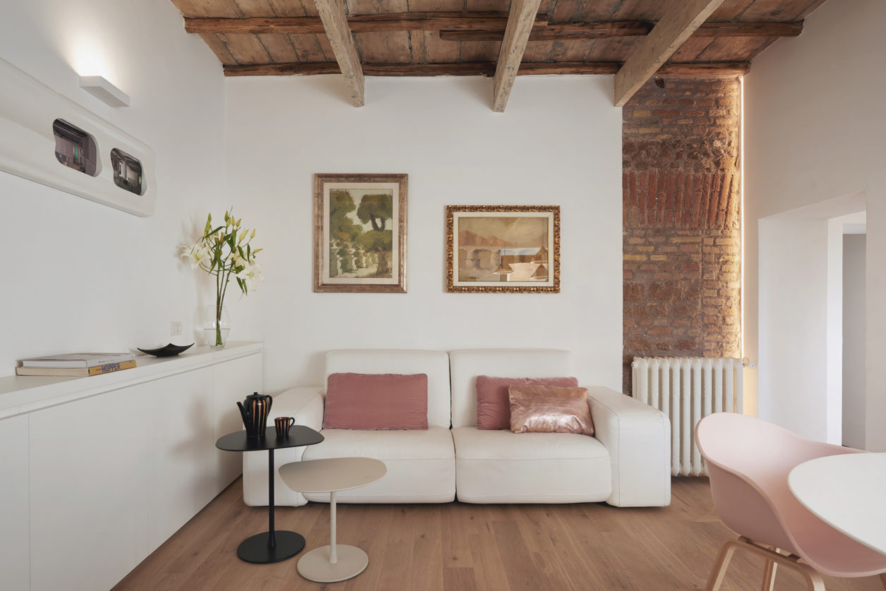 Эта квартира площадью 80 кв. м находится в самом сердце исторического Рима, в районе Трастевере. Местным зданиям присущи высокие потолки, дубовые балки, кирпичная кладка и, конечно, особая планировка – войти в квартиру можно только с галереи балкона, прямо как в классических итальянских фильмах