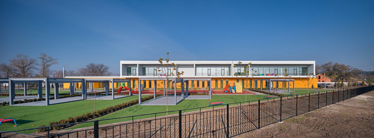 Современный детский сад находится в поселке городского типа Обуховка в Днепропетровской области и является ярким примером современной общественной архитектуры, где на первый план выходит функциональность и практичность, а линейные формы лишь завершают общий сценарий проекта, продуманный архитекторами Алексеем Валентировым и Екатериной Крыськовой