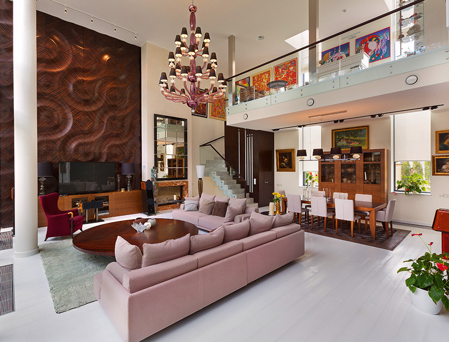 Удачное наполнение пространств сдержанной и в то же время элегантной и комфортной мебелью позволило сохранить ощущение камерности и уюта, не превратив жилые помещения в музей. Идея оформления интерьеров раскрывается и в растворении в плоскостях стен дверных проемов, что дает возможность акцентироватьвнимание на цветовых пятнах живописных полотен.