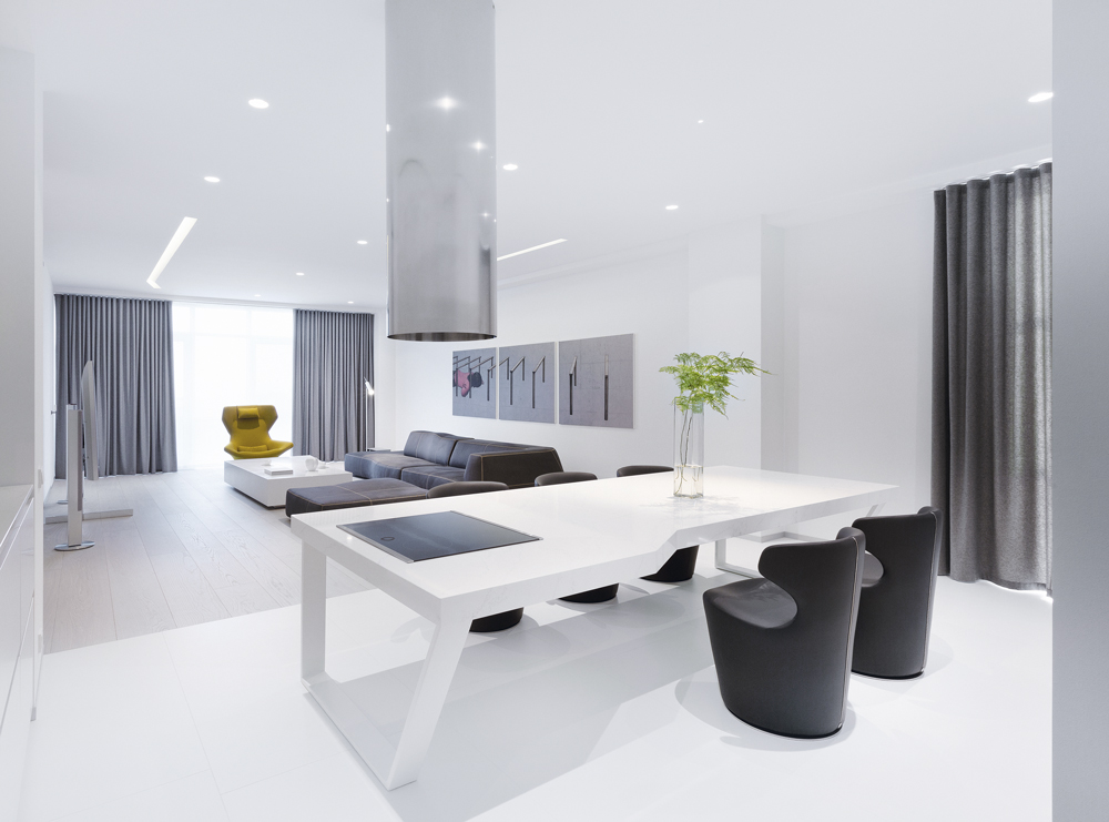 К слову, мебель здесь, от кожаных диванов до мягких кресел, пуфов и даже светильников, преимущественно итальянской марки B&B Italia. Она идеально отвечает минималистичному духу интерьера и выглядит так, словно создана четкими резкими движениями резца скульптора. При этом серые предметы мебели на фоне такой белоснежной подложки особенно фактурны. Однако кухонный стол сделан в Украине на заказ по эскизам автора, как и мебель в ванной комнате и санузле. Угловатые ломаные линии столешницы повторяют строгие геометричные формы мебели, создавая единую композицию. К слову, в нее встроена варочная поверхность, а над ней установлена круглая стальная вытяжка.