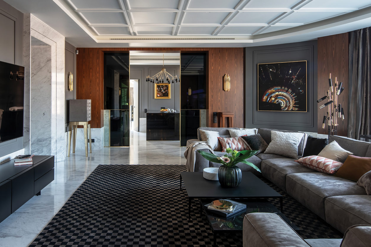 Главная гостиная – олицетворение гармонии материалов и цветов, где в основе теплые деревянные текстуры и коричневые оттенки. Весь холодный блеск камня оттеняют ореховые панели на порталах вокруг библиотеки Cover от Rimadesio, а между ними и пилястрами – полотна украинского художника.
