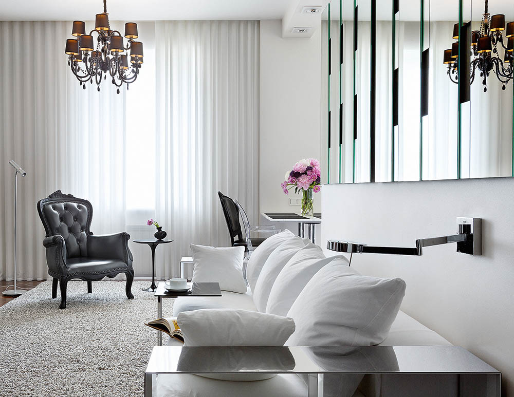 а с другой ― они органично подхватывают ритм интерьерного рисунка и легко «включаются» в игру глянцевых и отражающих поверхностей, визуально увеличивающих пространство. Особое внимание автор уделяет подбору светильников. Например, в спальне, выдержанной в контексте общей интерьерной концепции, на прикроватных тумбах ― лампы Kartell. Пару черному креслу в гостиной составляет роскошная декорированная подвесками из кристаллов люстра, а за ним красуется стильный торшер, напоминающий стальной фонарик на подставке. На месте бывшего балкончика-эркера удалось выкроить место для мини-кабинета с письменным столом и симпатичной зоной отдыха, где разместился удобный белый диван и стильный кофейный столик. Благодаря большим арочным окнам в пол здесь особенно хорошо в погожие дни. «Этот проект, ― признается Юрий, ― мне особенно нравится тем, что все в нем находится на своих местах. Он привлекает своей правильной геометричностью, четкой выдержанностью и, в тоже время, рафинированной современной элегантностью».